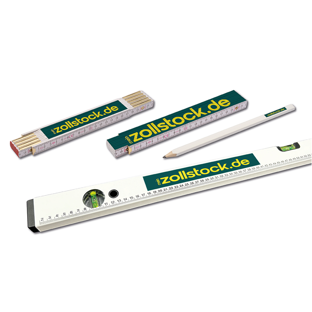 Ergänzend zu unseren Zollstöcken bieten wir darüber hinaus bedruckbare Wasserwaagen und Bleistifte an, die sich ideal als eigenständige Werbeartikel oder als Ergänzung im Set eignen. Die Zimmermannsbleistifte lassen sich ab Kartonmenge (144 St.) mit Logo oder Slogan versehen, während unsere Wasserwaagen mit Werbedruck schon ab 1 Stück verfügbar sind – als Werbeartikel wie auch als individualisiertes Geburtstagsgeschenk für passionierte Heimwerker.